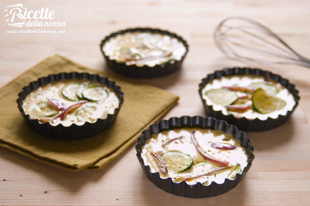 Sbattere le uova col formaggio, la farina e la panna e riempire le formine. Per ognuna distribuire qualche cucchiaiata di verdura.