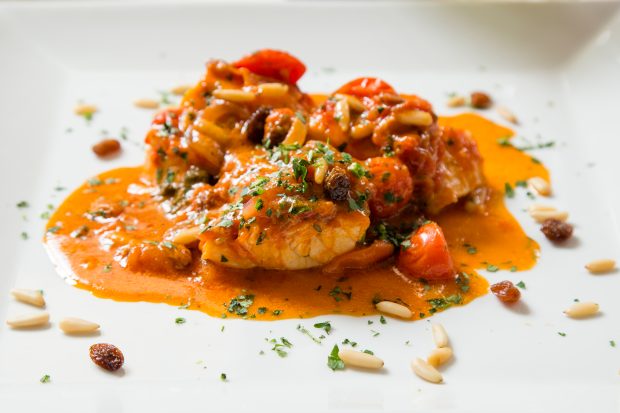 Aggiungete poi olive (snocciolate), pinoli e uva passa (non ammollata), quindi il baccalà fatto a pezzi e ben asciugato.