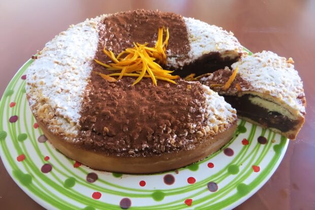 Lasciare raffreddare completamente la torta prima di sformarla e guarnirla con lo zucchero a velo, il cacao amaro e una julienne sottile di scorza d’arancia.